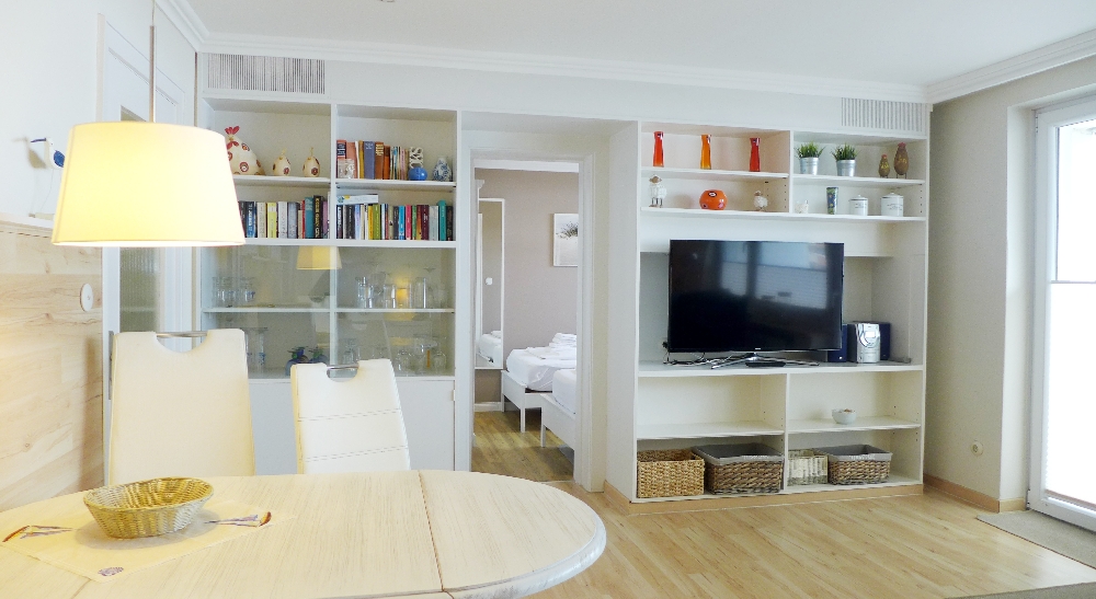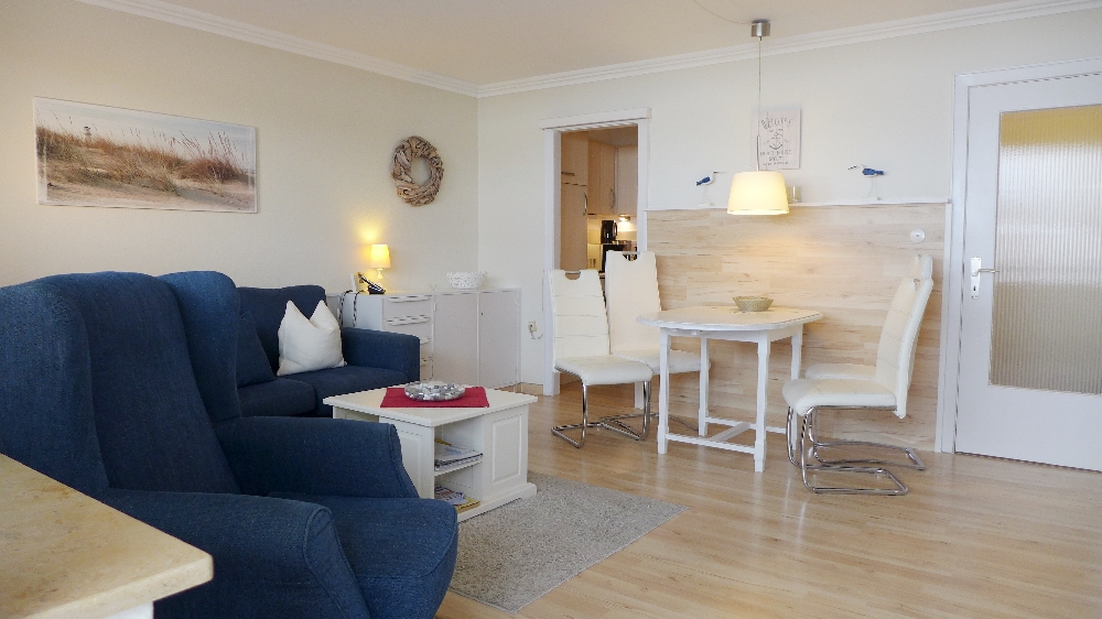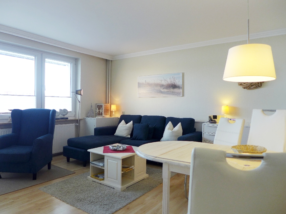 Sofa, ein Sessel, Wohnzimmerschrank, Flachbildfernseher, DVD-Player, Esstisch, großes Wohnzimmerfenster mit Blick zur Düne