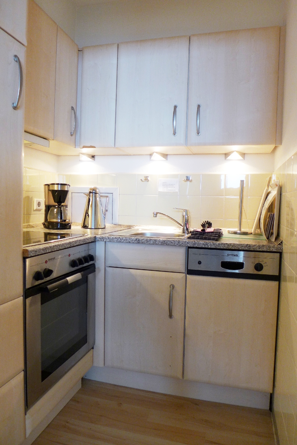 Herd mit Ceranfeld, Backofen, Geschirrspüler, Kühlschrank mit Gefrierfach, Microwelle, Kaffeemaschine, Wasserkocher, Toaster, Kochutensilien